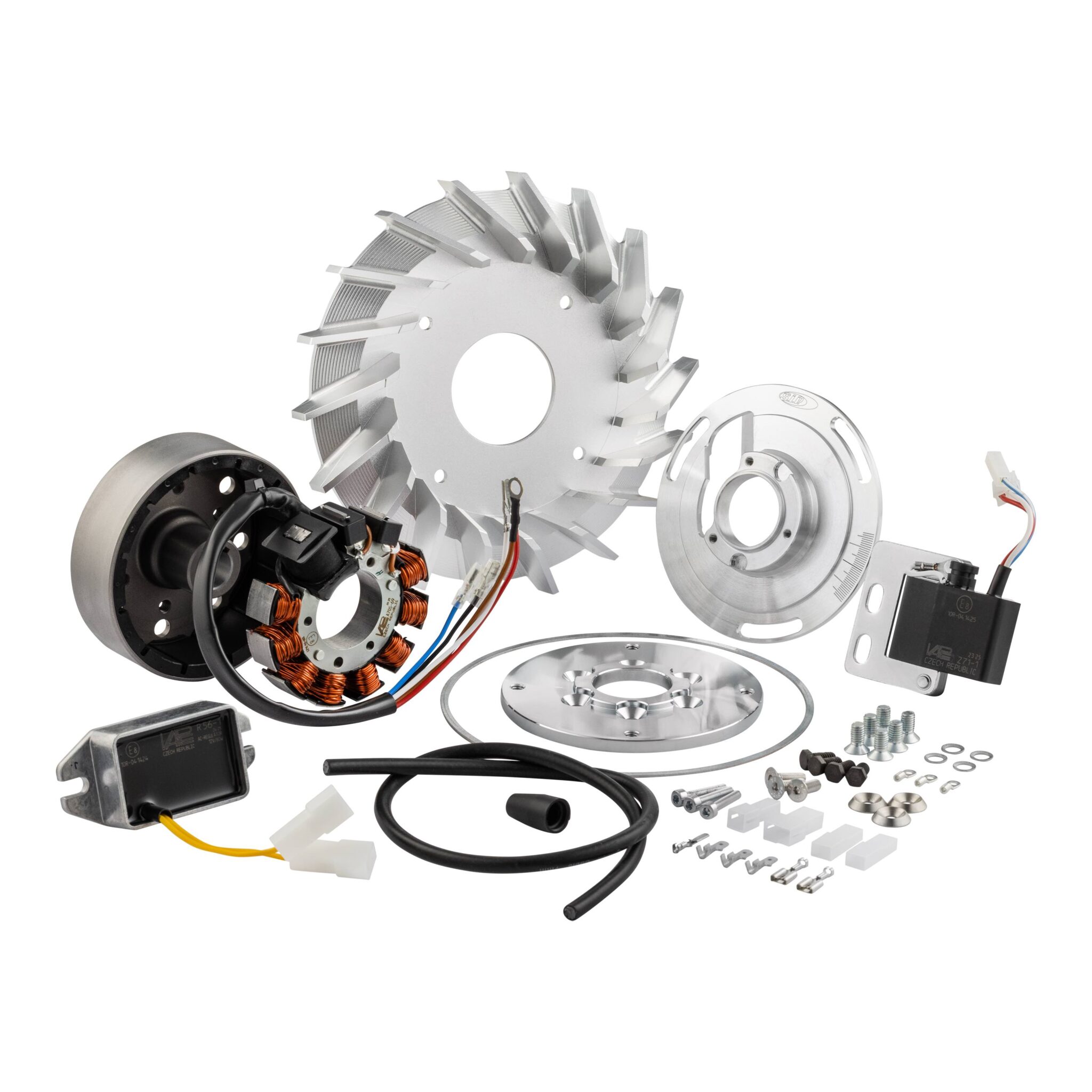 - Complete levering: inclusief grondplaat, CDI, vliegwiel, adapter voor de ventilatorring, gelijkrichter (DC) of spanningsregelaar (AC).