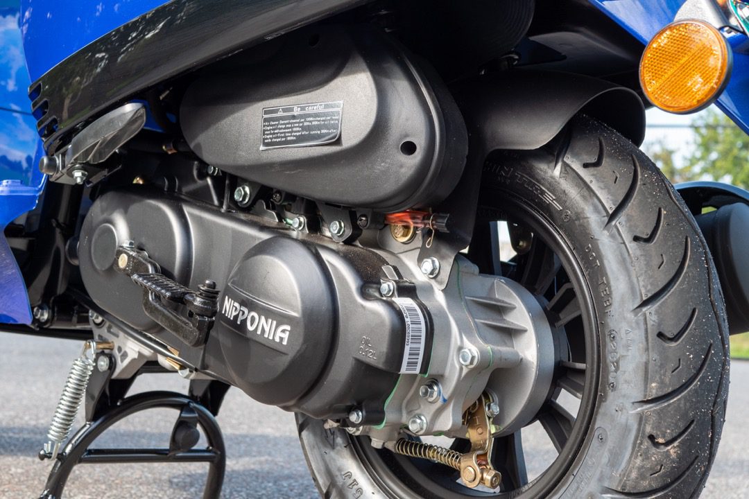 We reden met de Nipponia in wisselende weersomstandigheden, veelal op een nat wegdek. Een ondergrond waarop de standaard gemonteerde Ching Shen banden niet uitblinken is een droge ondergrond. Ze geven net genoeg vertrouwen om quasi sportief de bocht in te duiken. Het rijwielgedeelte is hier dan ook voldoende op berekend en voelt eigenlijk heel erg volwassen. De vering heeft een aardige goede mix tussen comfort en een stevige demping weten te vinden, samen met de comfortabele ruime zit is dit een scooter waar je het ook op langere afstanden makkelijk op uit kunt houden.