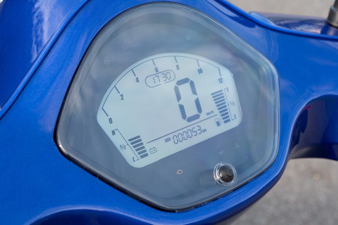 Op het stuur zien we bedieningsknoppen die zijn weggewerkt in de stuurkap en ook een compleet digitaal dashboard. Dit dashboard is ruim van opzet, licht in het donker lichtblauw op en voorziet je van alle informatie die je maar wenst. Naast de snelheidsmeter zien we namelijk een toerenteller, een duidelijke brandstofvoorraad indicatie, maar ook een klokje en een handige tripmeter mag niet ontbreken. Als extra laat het dashboard je de voltage van de accu aflezen. Het is stiekem vreemd dat we het moeten noemen, maar we worden eigenlijk wel blij van de bijna ouderwetse resetknop van de tripmeter, een functie die we op veel nieuwe scooters helaas moeten missen omdat de scooter bij elke nieuwe rit ‘zelf’ de tripmeter weer op 0 zet.