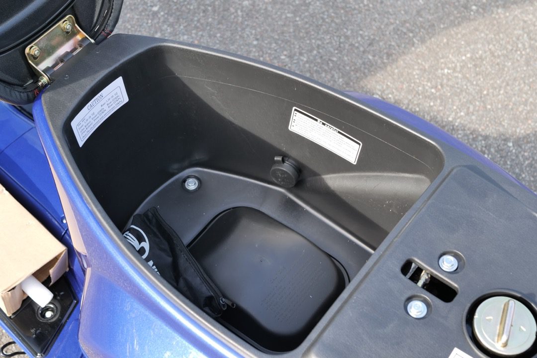 Met een verbruik van 1 op 40 (2,5L/100km) en een 6,5 liter grote brandstoftank zit het ook met de actieradius wel goed. Onder het zadel kijk je uit op de vulopening van de tank en tegelijk op een diepe helmbak. In het donker wordt het geheel door een led lampje aan de onderkant van het zadel verlicht, handig! Eveneens handig is de USB-poort die ‘gewoon’ aanwezig is. Met de ruimte zelf zit het wel goed, want we kregen er zonder teveel moeite een jethelm in kwijt. Voor wie niet genoeg heeft aan de ruimte onder het zadel is er nog een ‘dashboardkastje’ voor het kleinere grut, bovendien is deze door middel van de sleutel veilig af te sluiten.