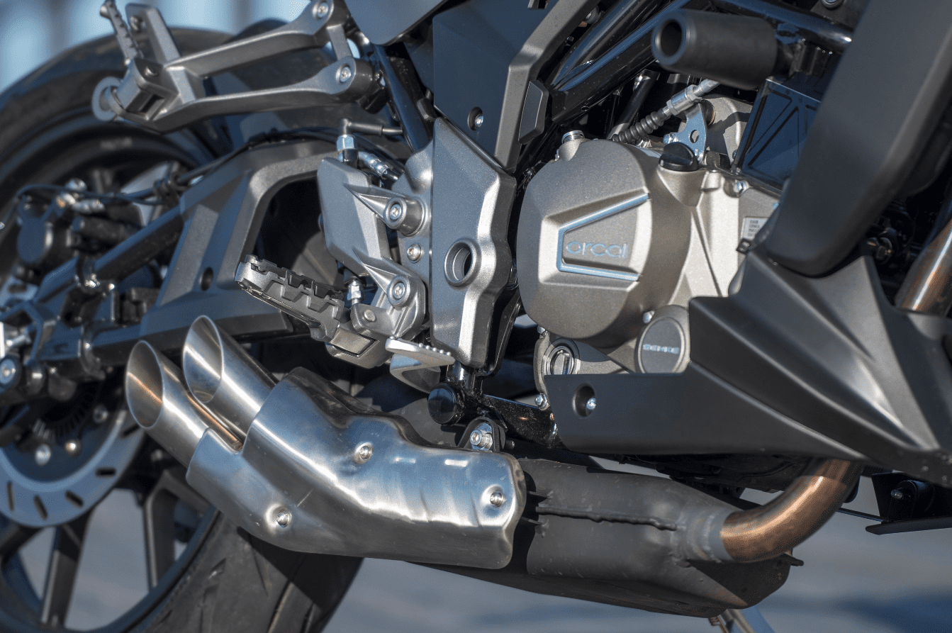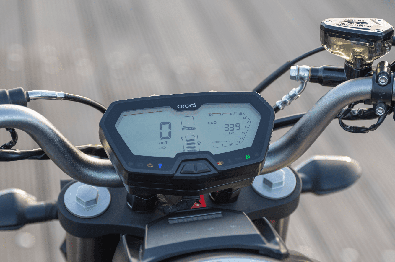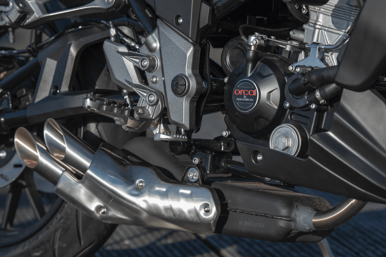 En daarbij waren we misschien nog wel het meest benieuwd naar het motorblok van de kleine 125. Hoe goed staat hij zijn mannetje in de stad en kan hij meekomen op de snelweg? De vloeistofgekoelde een-cilinder is afkomstig van Piaggio. Hij levert zijn maximale 15pk bij 9.750 toeren en 12,5Nm koppel bij 8.000 toeren. En in dat toerengebied is hij inderdaad op zijn best. Hij heeft het typische karakter van een lichte eencilinder en vanaf zo’n 6.000 tpm voel je dat hij nét even een beetje makkelijker door zijn toeren loopt. De Orcal produceert daarbij overigens een behoorlijk luide roffel, die wel bij zijn sportieve voorkomen past. Hij brengt je vlot naar de 80 km/uur, vervolgens gaat het wat minder snel. maar de 95 zal je in het display altijd wel zien verschijnen. Gaat het wegdek iets omlaag of heb je wind achter, dan kom je nog net boven de 100 km uit. Prima voor in de stad, die ene afslag over de snelweg naar het werk zal ook nog wel lukken. Een prima keuze voor de Belgische autobestuurder die een 125 mag rijden en hem voor het werk wil gebruiken of de jonge motorrijder met het A1-rijbewijs op zak. En die zal niets te klagen hebben over het rijwielgedeelte, want in exact dezelfde jas als zijn zwaardere broer kan je hem zelfs iets overgedimensioneerd noemen. De 50mm upside down voorvork in combinatie met een 300mm enkele schijf zijn meer dan genoeg om de lichte motor al je commando’s op te laten volgen. Het remvermogen is prima, wel had de voorrem iets meer gevoel en vooral opbouw mogen doorgeven aan de rijder. De bandenkeuze maakt dat meer dan goed. Orcal koos voor Metzeler Sportecs en die geven uitstekende grip. Absoluut van toegevoegde waarde bij een sportieve naked. Van de monoshock achterdemper is de veervoorspanning instelbaar zodat je nog een beetje met de hoogte kan spelen. Met een zithoogte van 810mm zal vrijwel iedereen prima met de voeten bij de grond kunnen. De zitpositie is zoals je het van een kleine sportieve naked verwacht, licht naar voren gericht en rond de 1.80m vallen je benen nog steeds in de uitsparingen van de tank. Met de compacte SK01 is het met 146 kilo rijklaar makkelijk manoeuvreren en hij past altijd wel ergens in je schuur of in de stalling op het werk. Tenslotte het uiterlijk: Orcal heeft het, zoals eerder gezegd, over een ‘alien-streetfighter-stijl’. Wij vinden het wel passend omschreven. Een agressieve, voorwaartse styling van een streetfighter gecombineerd met de bijna buitenaardse vormgeving rondom de koplamp en de luchtinlaten naast de tank. Maar ook de styling van de dubbele uitlaatdempers en de puntige achterpartij sluit er naadloos bij aan.