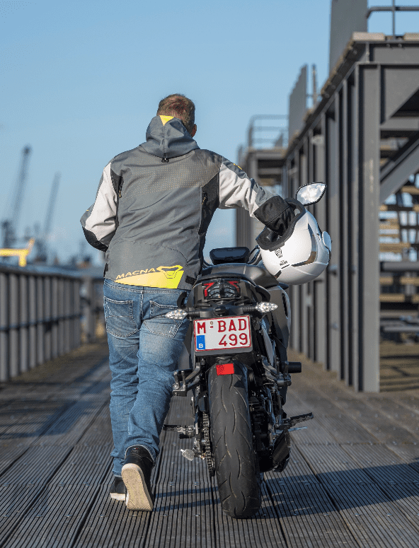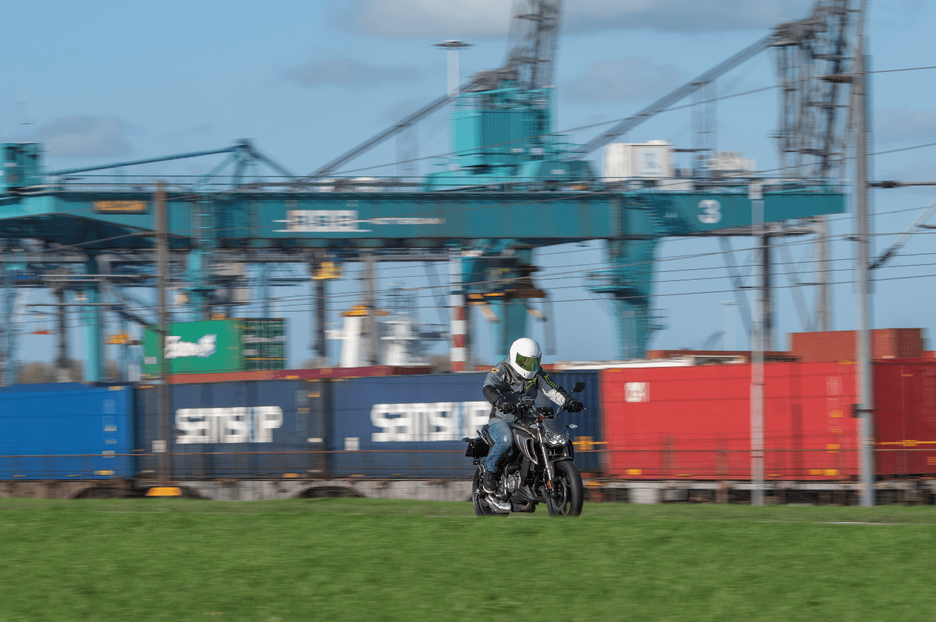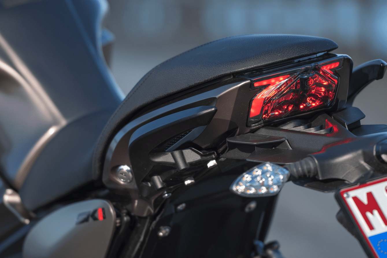 En daarbij waren we misschien nog wel het meest benieuwd naar het motorblok van de kleine 125. Hoe goed staat hij zijn mannetje in de stad en kan hij meekomen op de snelweg? De vloeistofgekoelde een-cilinder is afkomstig van Piaggio. Hij levert zijn maximale 15pk bij 9.750 toeren en 12,5Nm koppel bij 8.000 toeren. En in dat toerengebied is hij inderdaad op zijn best. Hij heeft het typische karakter van een lichte eencilinder en vanaf zo’n 6.000 tpm voel je dat hij nét even een beetje makkelijker door zijn toeren loopt. De Orcal produceert daarbij overigens een behoorlijk luide roffel, die wel bij zijn sportieve voorkomen past. Hij brengt je vlot naar de 80 km/uur, vervolgens gaat het wat minder snel. maar de 95 zal je in het display altijd wel zien verschijnen. Gaat het wegdek iets omlaag of heb je wind achter, dan kom je nog net boven de 100 km uit. Prima voor in de stad, die ene afslag over de snelweg naar het werk zal ook nog wel lukken. Een prima keuze voor de Belgische autobestuurder die een 125 mag rijden en hem voor het werk wil gebruiken of de jonge motorrijder met het A1-rijbewijs op zak. En die zal niets te klagen hebben over het rijwielgedeelte, want in exact dezelfde jas als zijn zwaardere broer kan je hem zelfs iets overgedimensioneerd noemen. De 50mm upside down voorvork in combinatie met een 300mm enkele schijf zijn meer dan genoeg om de lichte motor al je commando’s op te laten volgen. Het remvermogen is prima, wel had de voorrem iets meer gevoel en vooral opbouw mogen doorgeven aan de rijder. De bandenkeuze maakt dat meer dan goed. Orcal koos voor Metzeler Sportecs en die geven uitstekende grip. Absoluut van toegevoegde waarde bij een sportieve naked. Van de monoshock achterdemper is de veervoorspanning instelbaar zodat je nog een beetje met de hoogte kan spelen. Met een zithoogte van 810mm zal vrijwel iedereen prima met de voeten bij de grond kunnen. De zitpositie is zoals je het van een kleine sportieve naked verwacht, licht naar voren gericht en rond de 1.80m vallen je benen nog steeds in de uitsparingen van de tank. Met de compacte SK01 is het met 146 kilo rijklaar makkelijk manoeuvreren en hij past altijd wel ergens in je schuur of in de stalling op het werk. Tenslotte het uiterlijk: Orcal heeft het, zoals eerder gezegd, over een ‘alien-streetfighter-stijl’. Wij vinden het wel passend omschreven. Een agressieve, voorwaartse styling van een streetfighter gecombineerd met de bijna buitenaardse vormgeving rondom de koplamp en de luchtinlaten naast de tank. Maar ook de styling van de dubbele uitlaatdempers en de puntige achterpartij sluit er naadloos bij aan.