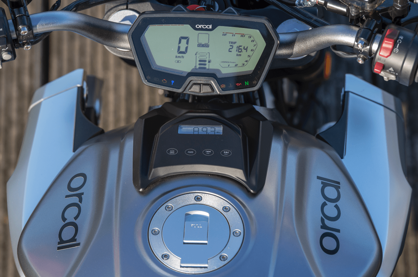 De SK01 en SK03 zijn qua uiterlijk identiek. Ze zijn voorzien van led-verlichting rondom en een duidelijk LCD-instrumentenpaneel waarin je naast de versnellingindicator ook snelheid, toerental, verreden kilometers en brandstofniveau kan aflezen. Een klokje ontbreekt. Knoppen onderaan het display geven je de mogelijkheid te kiezen tussen kilometers of mijlen en trip of odo. Daarnaast beschikken de SK’s over een USB-aansluiting, iets wat nog steeds niet bij alle grote merken standaard is. Om die USB aansluiting te vinden moet je overigens wel het zadel lospakken, want hij zit eronder vastgeklikt. Je kan je smartphone desgewenst laden, je kan ook via blue-tooth je smartphone koppelen met een speaker! Via diezelfde audio-unit, die zich voorop de tank bevindt, kan je verbinding maken en je favoriete playlist koppelen, of de radio-functie selecteren en je favoriete station opzoeken. Omringende automobilisten wierpen enigszins verbaasde blikken op ons bij het horen van muziek tijdens het wachten voor de vele rode verkeerslichten. Leuk, maar laten we het vooral hebben over het moment dat we de Orcals de sporen gaven.