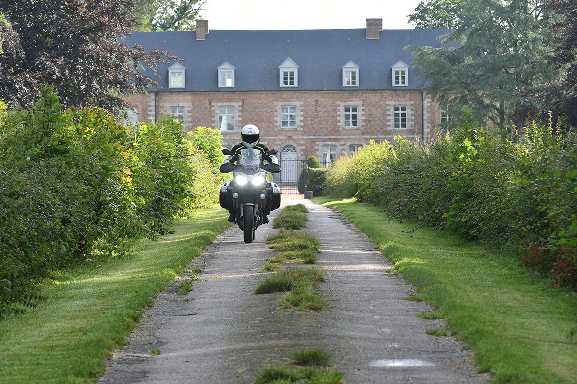 Als we voorbij Calais zijn is de regen inmiddels voorbij en rest ons nog wat spray van vrachtwagens die we inhalen. De eerstvolgende stop is Le Touquet, bekend van de strandraces en een plaatsje waar de vele hoogbouw het toerisme naar zich toe heeft getrokken. De Versys 650 wordt vergezeld door een Ninja 650 tourer die duidelijk wat compacter is dan de vrij forse Versys 650. De 2022 looks zijn duidelijk een stuk spannender dan die van het 2021 model waarmee wij eerder reden. Een grote kuip met goede graphics, waarbij de kleuren wit en grijs die met groen worden afgewisseld een prima combi is. De kuipruit is in tegenstelling tot die van de Versys niet verstelbaar, maar door de lage zitpositie houd je jezelf prima uit de wind. Ondertussen schiet het kwik naar zo’n 25 graden en lopen de badgasten zonder t-shirt over het strand.