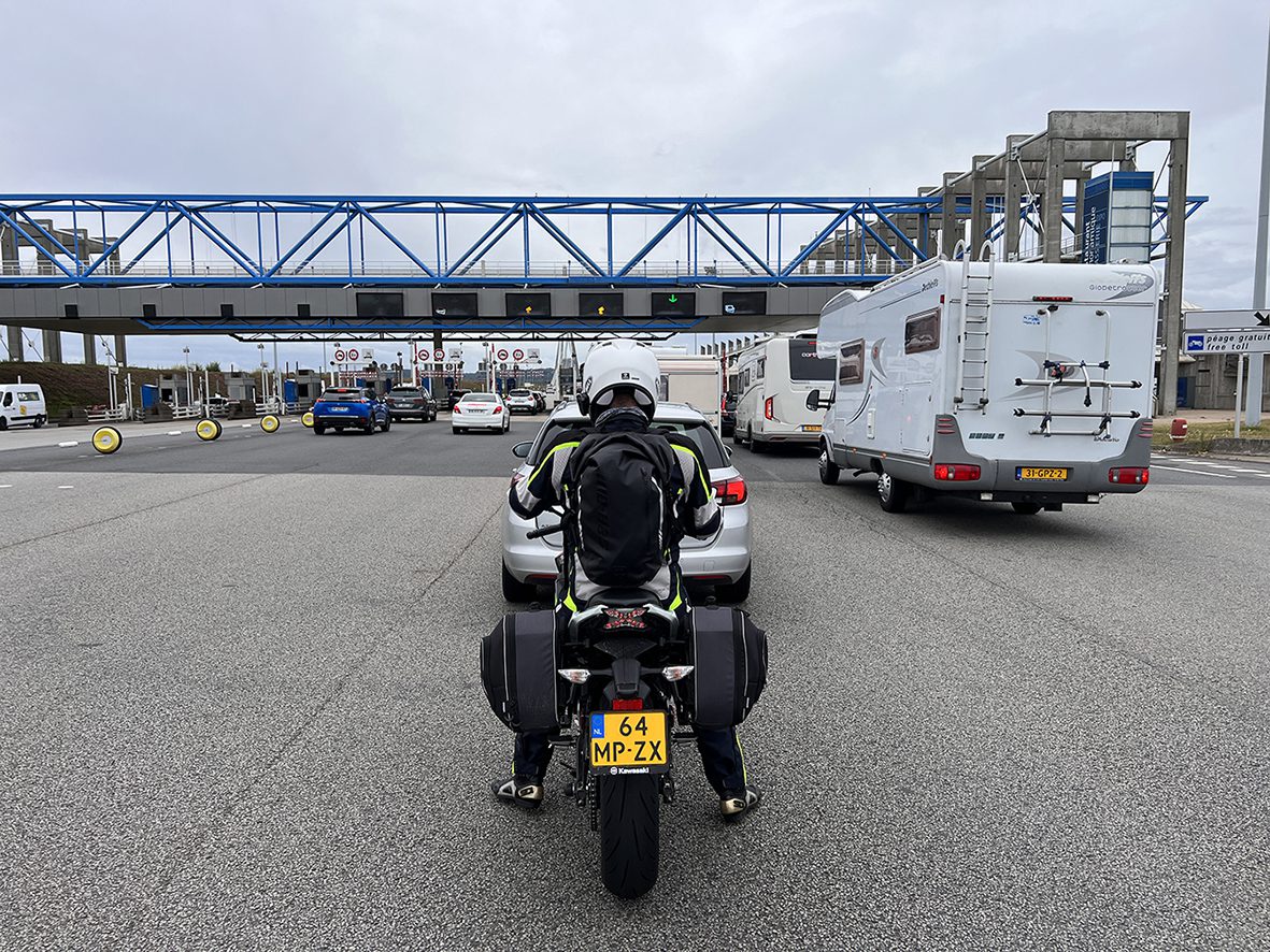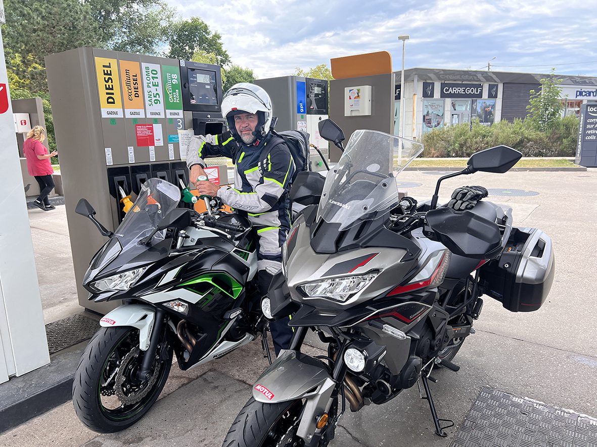 Wij rijden vanaf Rouen richting Abbeville volledig binnendoor en rijden door dorpjes waar al 100 jaar niets is gebeurd richting Lens om vanaf daar weer aan te sluiten op de snelwegen. De gehele reis staat het verstelbare windscherm op de hoogste stand zodat we prima uit de wind zitten. Met ruim 300 km op de teller komen er noodkreten op de Cardo binnen omdat de benzinemeter van de Ninja nu toch echt gaat knipperen. We besluiten de eerstvolgende afslag te nemen en nog geen 200 meter vanaf de snelweg tank je zomaar 30 cent goedkoper. We tanken beide motoren tot de rand toe vol en vervolgen onze weg door het centrum van Lille via Kortrijk en Gent om naar Antwerpen te rijden. De laatste 100 km naar Rotterdam gaan soepel zodat we zonder enige file de stad weer binnenrijden.