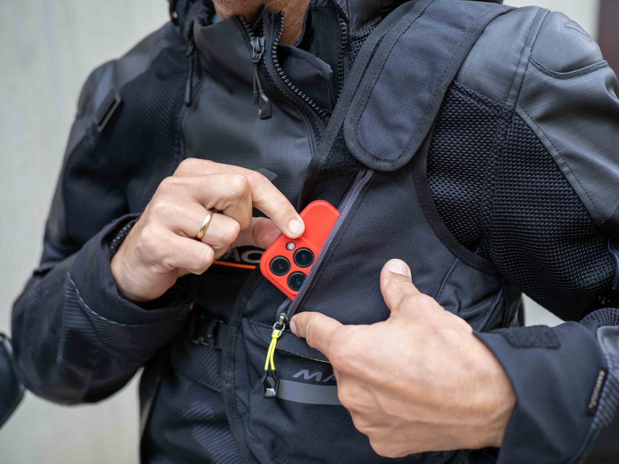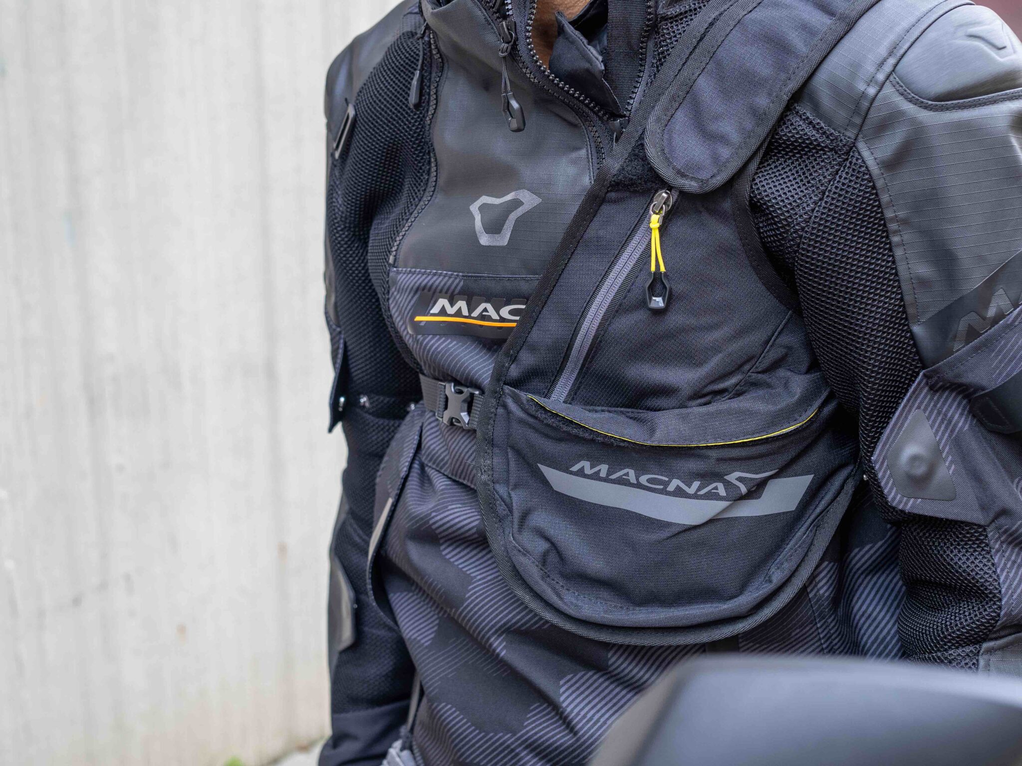 Het product wordt geleverd in plastic met kartonnen informatiekaart waarop de Holster geknoopt zit. De Holster is gemaakt van polyester met een brede schouderband en een riem. De schouderband is middels klittenband verstelbaar net als de riem die om je middel zit middels een verschuifbare band. De holster is zwart en voorzien het Macna logo dat reflecterend werkt. De binnenvoering is geel van kleur waarbij het bovenste deel middels een rits te openen is. Deze ruimte is maximaal 20 cm diep en 18 cm breed. Een tweede opbergvak is bereikbaar door een opening met klittenband en 9cm op het breedste deel en 14 cm diep zodat je er gemakkelijk een grote telefoon eventueel met powerbank in kwijt kan. De holster doe je eenvoudig om en kan je op bijna elke omvang verstellen. Hij zit tijdens het rijden prettig en je merkt er eigenlijk heel weinig van, wat direct een pluspunt is. Ook is de plek waar de holster zit, best prettig omdat je er gemakkelijk bij kunt. In het bovenste deel past precies een normale portemonnee zodat je alle waardevolle spullen direct bij de hand hebt. Een kleine regenbui kan hij makkelijk hebben, of alles droog blijft na uren in de regen, dat hebben we niet getest. Een aanrader!