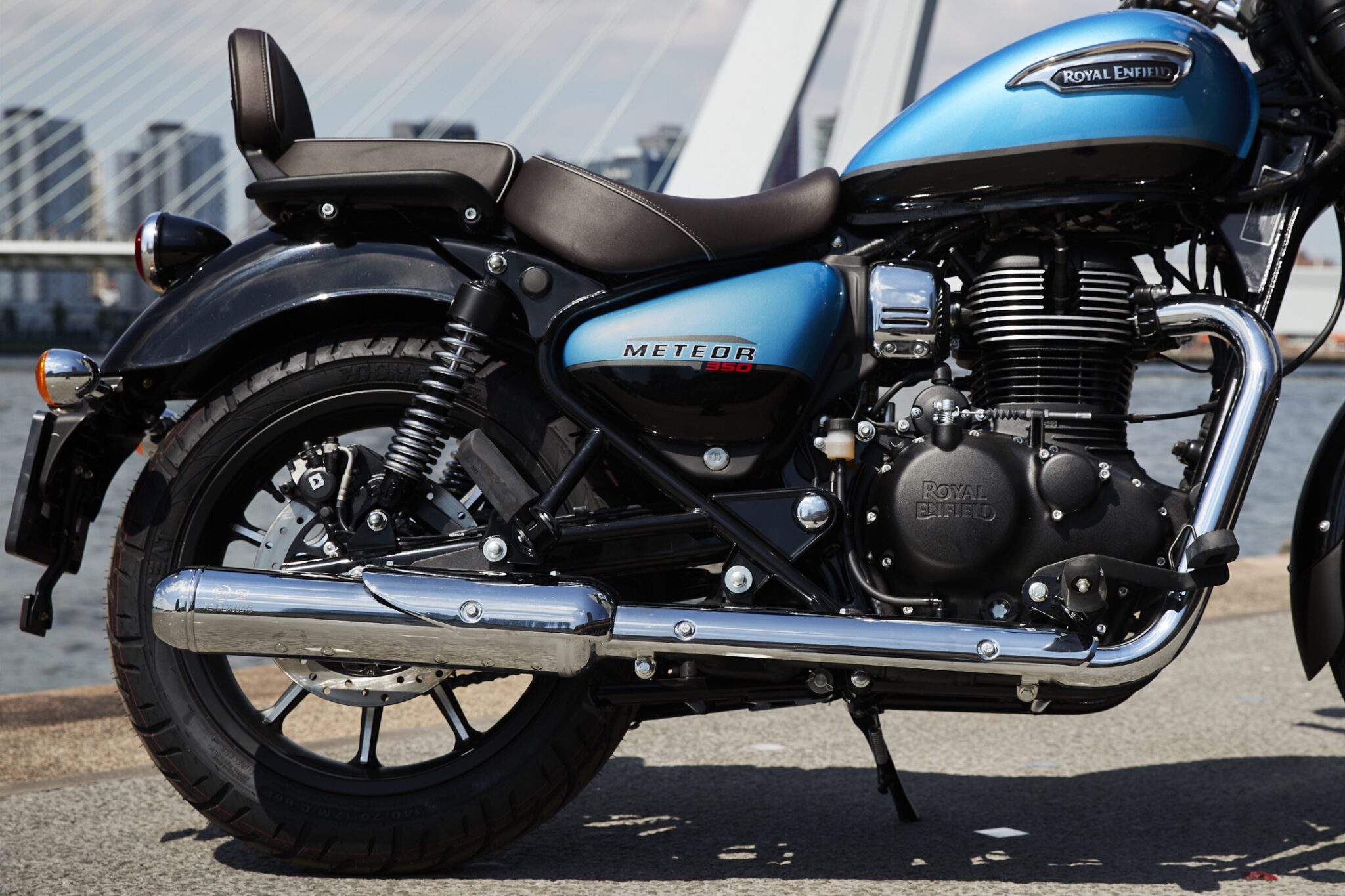 Voor deze dag hebben we de beschikking over de Meteor 350 Stellar (alleen in het zwart leverbaar) en een bruine en blauwe Supernova. Die Supernova heeft ten opzichte van de Stellar naast een andere kleurstelling, tevens een windschermpje en net iets andere velgen. Ze zijn niet anders van vorm, maar uitgerust met gedeeltelijk gepolijste randen. Vandaag niet aanwezig, zijn de rode en gele Fireball-uitvoeringen. De Fireball heeft als belangrijkste optische verschil de zwarte uitlaat en, afhankelijk van de kleur, een rode of gele striping op de velgranden.