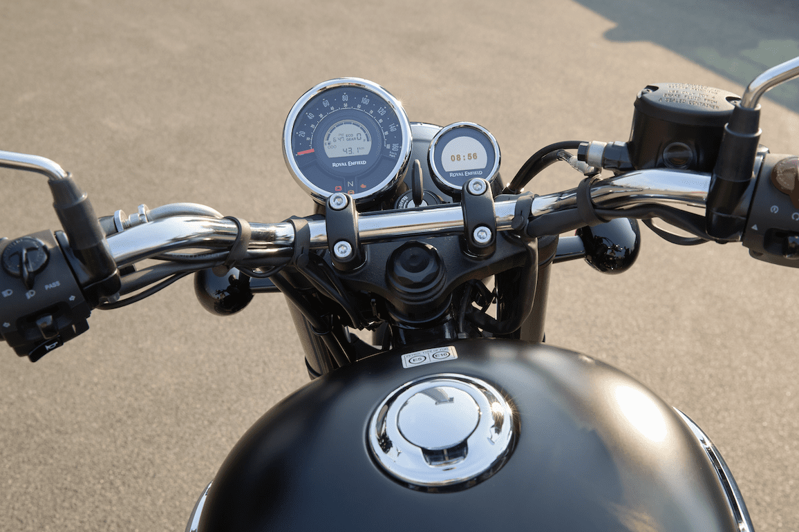 Want ja, hij mag dan misschien niet meedoen aan de pk-wedloop, die 20 paardenkrachten zijn voldoende om goed met het verkeer mee te kunnen komen. Vanaf lage toeren is er genoeg ‘porrie’ om ook in een hogere versnelling makkelijk met het verkeer mee te komen. Wil je opschieten, dan tik je 1 of 2 versnellingen terug en zal je nog verrast worden door deze eenpitter. Royal Enfield geeft zelf een topsnelheid door van 114 échte kilometers, op de teller gaat hij er overheen. Die teller oogt op het eerste gezicht wellicht wat klassiek, maar is moderner dan je denkt. Naast de analoge snelheidsmeter, zien we centraal namelijk een digitaal display. Je bedient het schermpje door middel van de knop op het stuur en het laat je onder andere info zien over de verreden afstanden, de tijd, brandstofvoorraad en de ingeschakelde versnelling. Meer heb je eigenlijk niet nodig, het geheel is duidelijk af te lezen en dat is het belangrijkste.