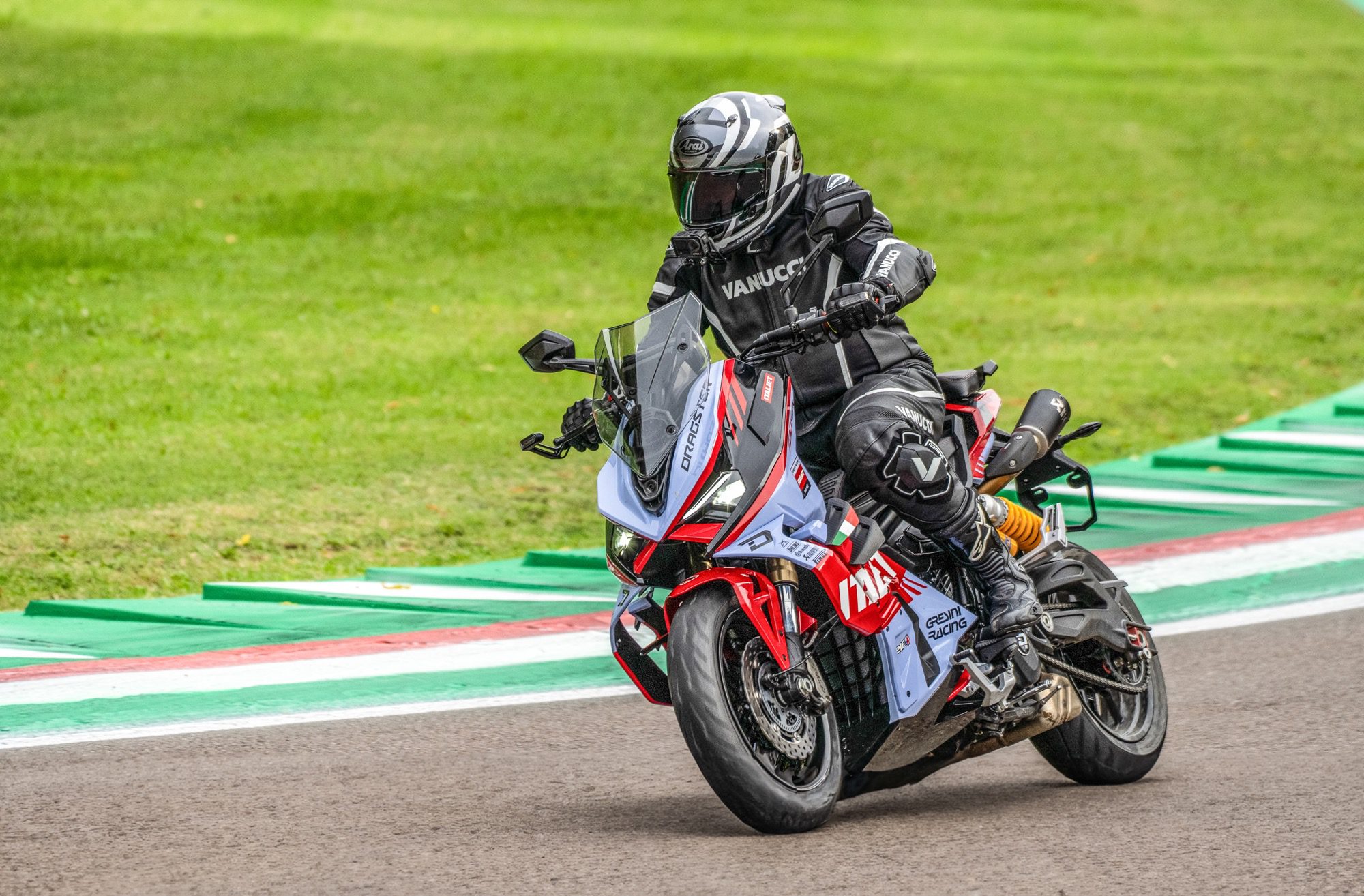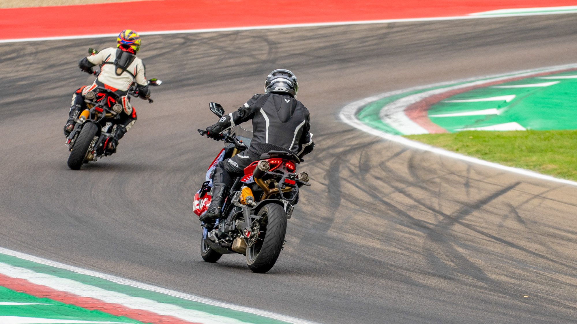 Het pak arriveerde en kon direct mee naar het circuit van Imola. Daar stonden de Italjet Dragster 700’s al klaar voor een eerste sessie. Het voelde bijna als een herintroductie: een oude bekende op een nieuwe manier, maar dan stukken comfortabeler. Het leer is stevig en kwalitatief, zonder stug aan te voelen, en de afwerking is strak: naden, ritsen en naden zijn netjes weggewerkt. Meteen viel de bewegingsvrijheid op: het pak knelt nergens en laat je vrij leunen en sturen.